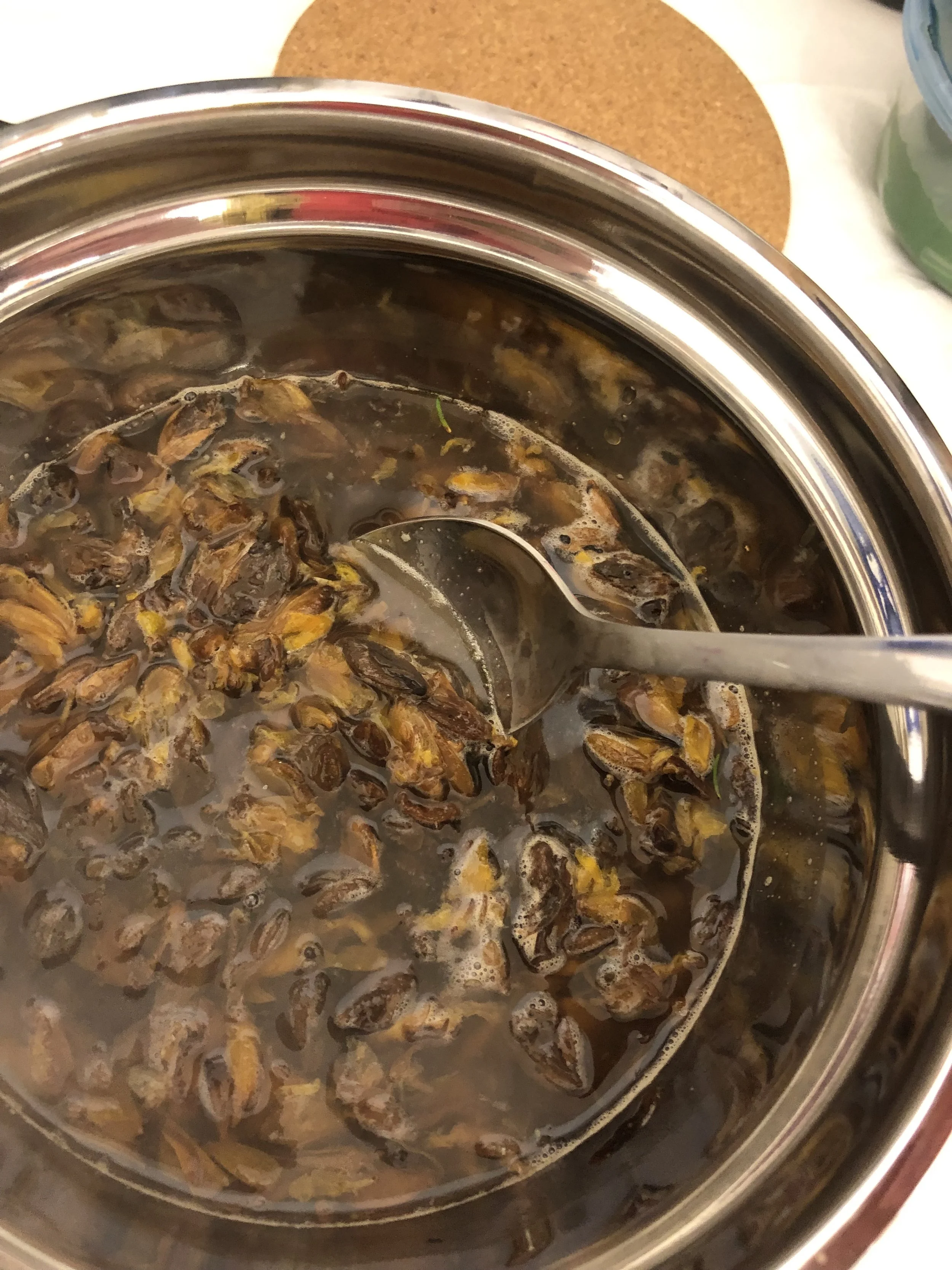 As well as attempting to grow all these plants (which I wasn’t planing to this year) I’ve also been out and about salvaging materials. Like fallen cones and lichen from Crathes. Cliff top flowers from the nature reserve at Crawton. But between ruining picnics on the hunt for lichen and hanging over cliffs I’ve also been gathering food waste! I’ve made printing pastes from melon skin, pomegranate skins and next up its onion skins. I can’t wait to see what the red skins will turn out like.