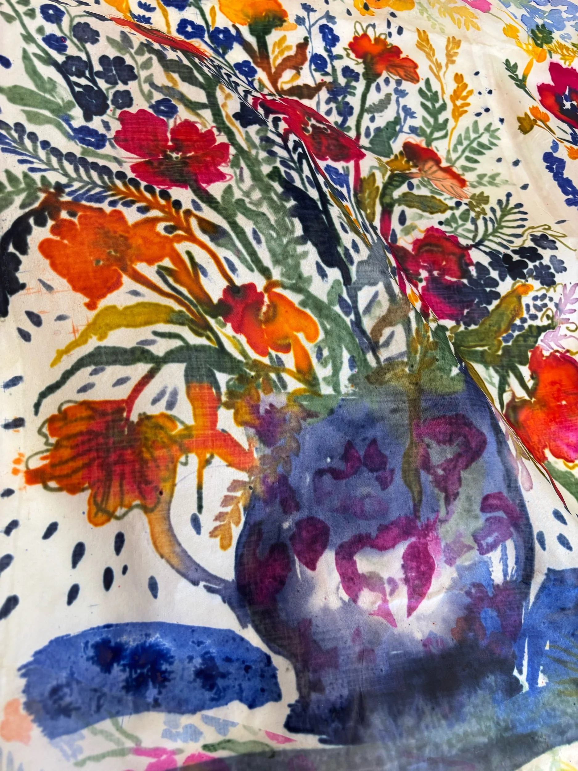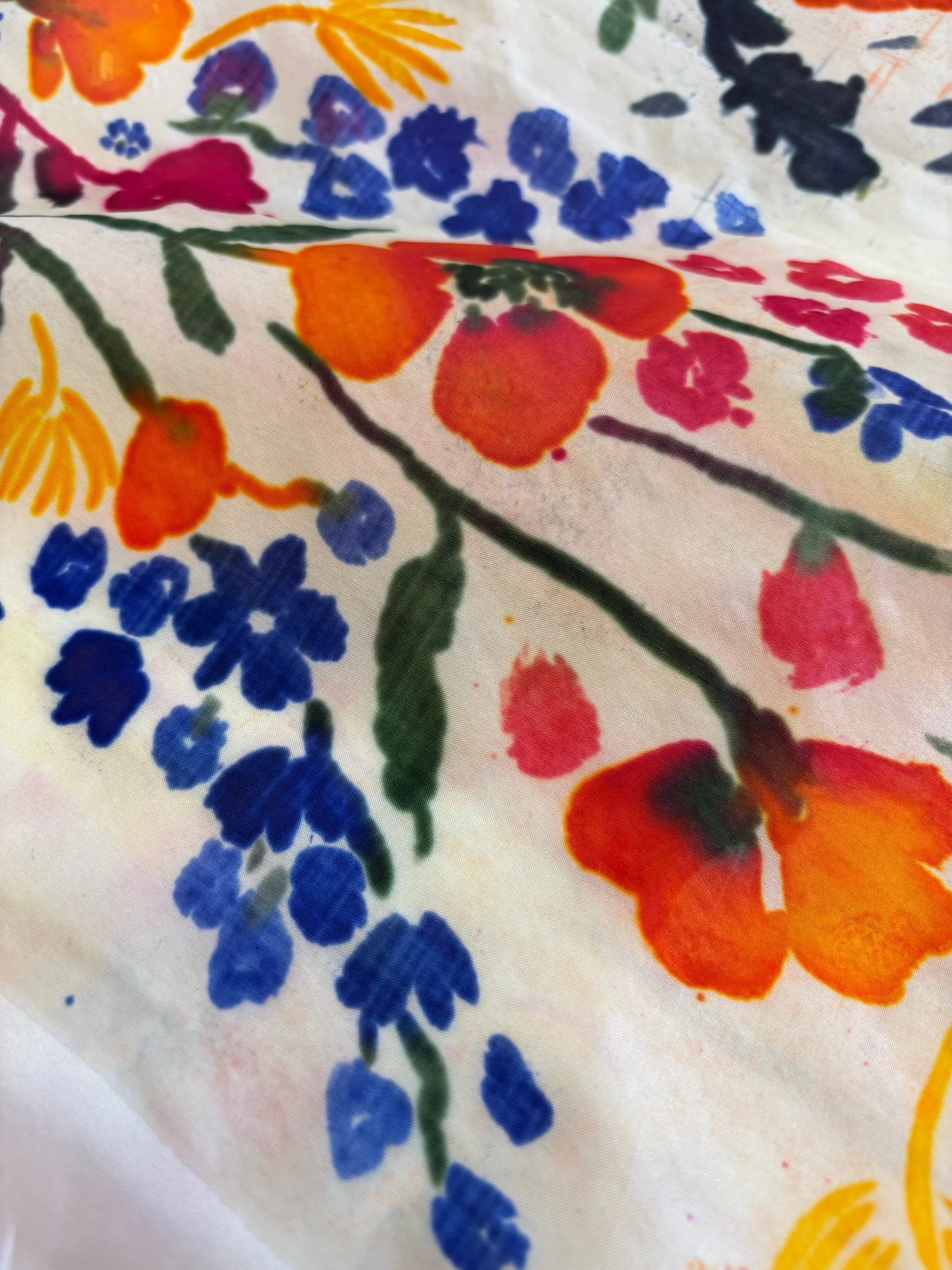 You’ll begin by experimenting with mark‑making and painterly application methods, building confidence as you explore how dyes behave on fabric. Through guided play and sample‑making, you’ll develop a personal palette and visual language before moving on to your final piece. By the end of the day, you’ll have created a unique printed silk neckerchief, perfect for framing, wearing, or incorporating into future textile projects.